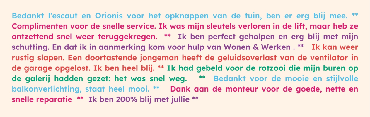 Elke dag weer doen wij ons best voor een fijne woonomgeving voor onze huurders. Soms gaat er iets mis en dan horen we dat – en dat mag. Gelukkig krijgen we ook veel complimenten. Dank daarvoor! Ze inspireren ons om met zorg en aandacht voor u te blijven werken.